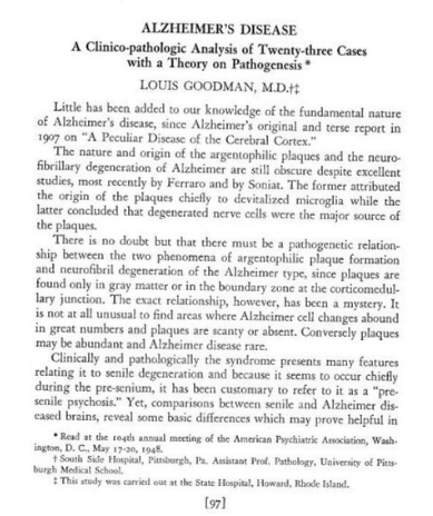 In 1948, another American doctor, Louis Goodman, presented his ideas on the cause of Alzheimer’s disease at a meeting of the American Psychiatric Association. Dr. Goodman was the first person to discuss the potential differences of Alzheimer’s disease and senile dementia. He also talked about possible metabolic foundations of Alzheimer’s disease, and he speculated on a possible role of microglia and a disturbed iron homeostasis. This was the beginning of an understanding that there were overlaps of the pathology of Alzheimer’s disease with other human neurodegenerative diseases and forms of presenile dementia.