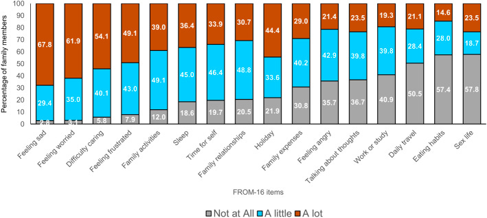 The FROM-16 mean total score from the UK study was 17.48 (broken down as 7.86 for the emotional domain and 9.6 for the personal and social life domain.) Of the 16 items measured, “feeling sad”, “feeling worried, and “difficulty caring” had the highest mean scores. The study showed females experienced significantly more impact than males. Below is a chart showing the study results from the 16 items.
